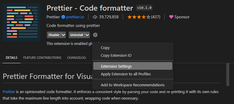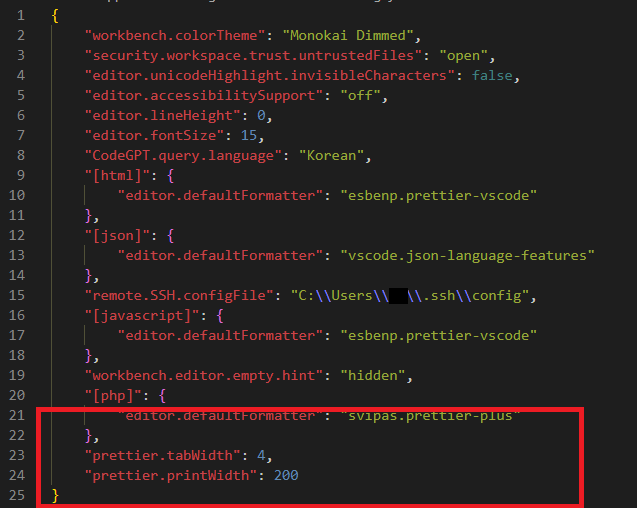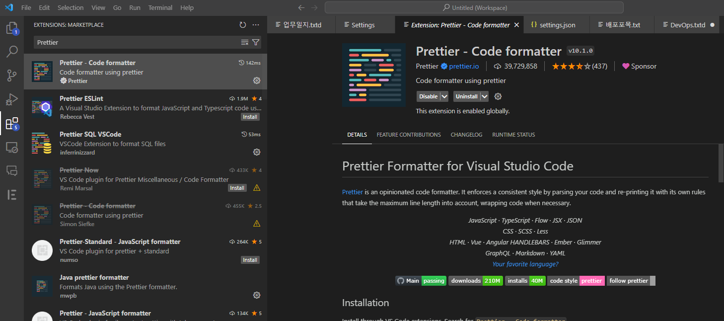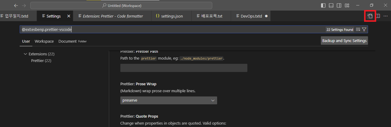 prettier.tabWidth (default: 2) : 텝을 눌렀을 때 몇칸이 띄어지는지를 설정합니다. 저는 보통 4를 놓고 씁니다.
