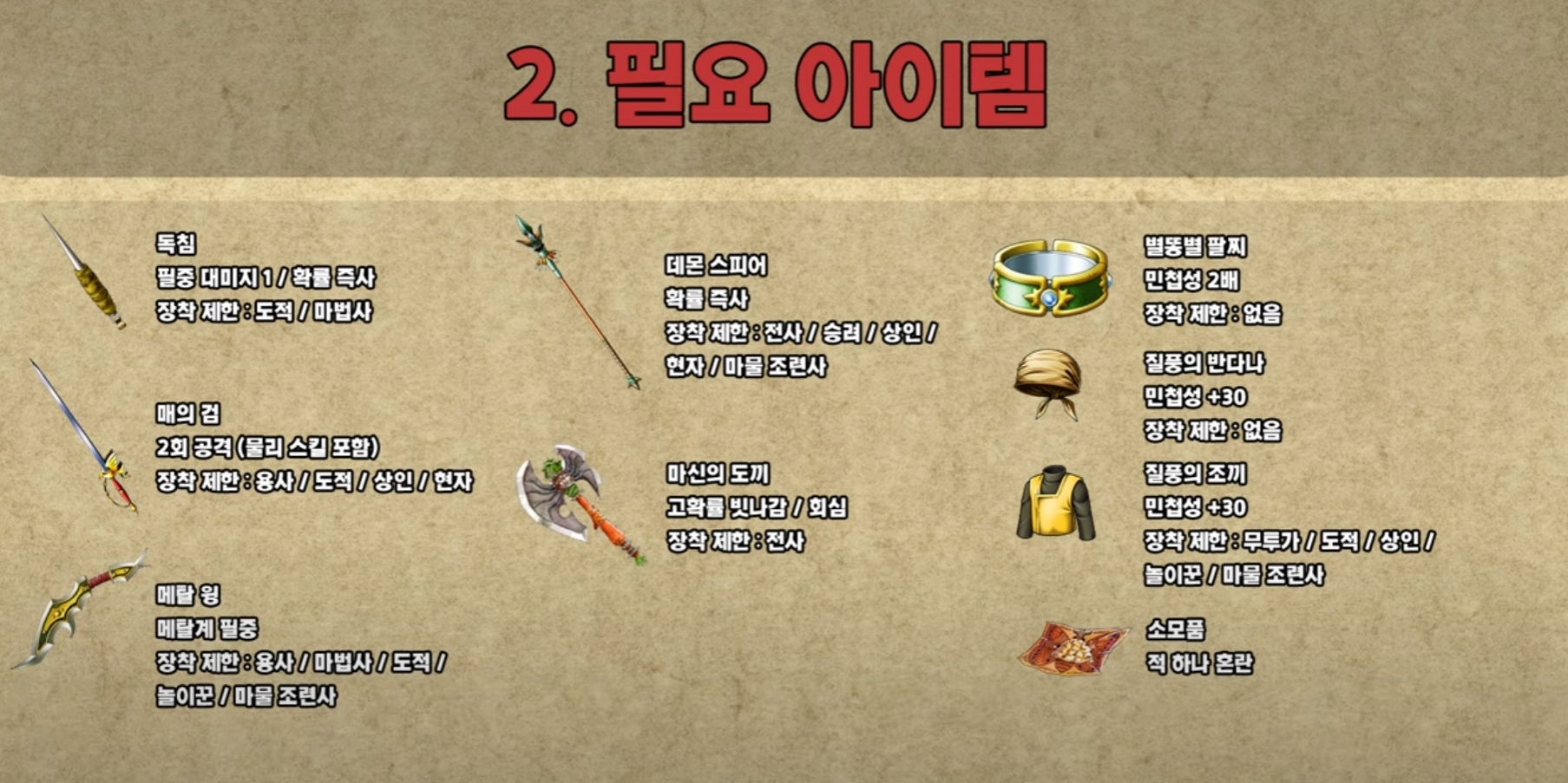 | 무기 | 독침 | 필중 데미지 1 / 확률 즉사 | 도적 / 마법사 |